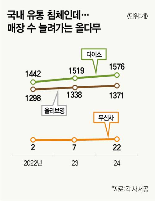 기업가치도 기존 유통 공룡을 넘어선다. 증권가가 추정하는 올다무 기업가치를 합산하면 15조원을 훌쩍 넘긴다. 유통 빅3로 분류되는 롯데쇼핑, 이마트·신세계백화점, 현대백화점 등 시가총액을 다 더해도 8조원에 한참 못 미친다. 매장 수 증감을 살펴봐도 올다무 선전이 눈에 띈다. 지난해 올다무 국내 오프라인 매장 합산 개수는 2969개. 2년 전인 2022년 대비 227개나 늘었다. 절대 비교는 어렵긴 하지만 같은 기간 이마트는 3개 점포를 줄였다. 롯데백화점은 지난해 마산점을, 현대백화점은 올해 디큐브시티점을 폐점하는 등 점포 정리에 나섰다.