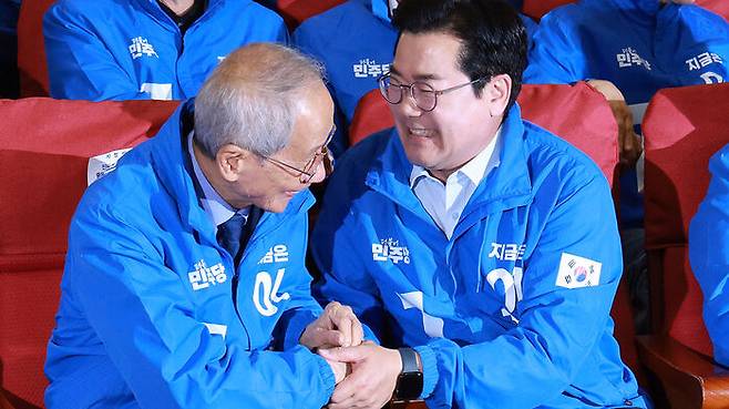 ▲ 더불어민주당 윤여준, 박찬대 상임총괄선대위원장이 3일 지상파 출구조사 결과에서 이재명 후보가 51.7%로 앞서는 것으로 발표되자 기뻐하고 있다.