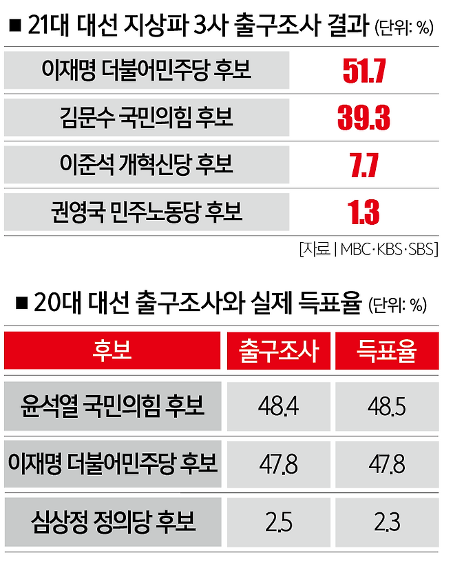 지상파 방송 3사가 3일 실시한 제21대 대선 출구조사에서 이재명 더불어민주당 대선후보가 51.7%를 기록해 39.3%를 기록한 김문수 국민의힘 대선후보를 12.4%포인트 따돌리고 1위에 올랐다. 제3의 후보로 완주한 이준석 개혁신당 대선후보는 7.7%를 기록했다.