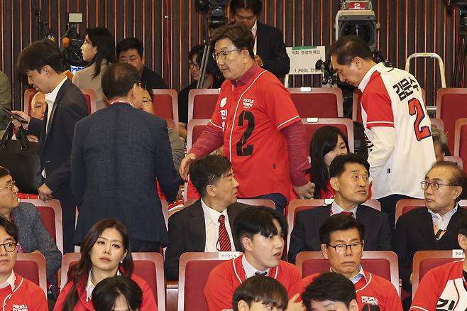 한동안 자리를 지키던 김용태 비대위원장은 40분쯤 지나 자리에서 일어나 밖으로 향했다. 김 위원장은 '출구 조사 결과를 어떻게 봤냐'는 취재진의 말에 "(개표 상황) 진행 중이니까 겸허하게 지켜보겠다"고 짧게 답한 뒤 차를 타고 비대위원장실로 이동했다.