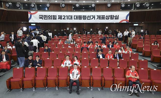 김용태 비상대책위원장 3일 서울 여의도 국회 도서관에 마련된 국민의힘 개표 상황실에서 제21대 대통령 선거 방송3사 출구조사 결과를 지켜보다 자리를 떠나는 가운데, 앞 자리에 안철수, 황우여 공동선대위원장이 자리에 앉아 있다.