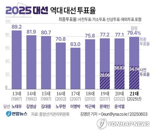 (서울=연합뉴스) 이재윤 김영은 기자 = 제21대 대통령선거의 최종투표율이 79.4%로 잠정 집계됐다.