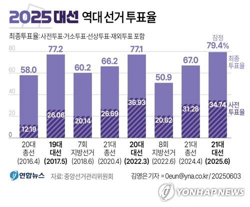 (서울=연합뉴스) 이재윤 김영은 기자 = 제21대 대통령선거의 최종투표율이 79.4%로 잠정 집계됐다.