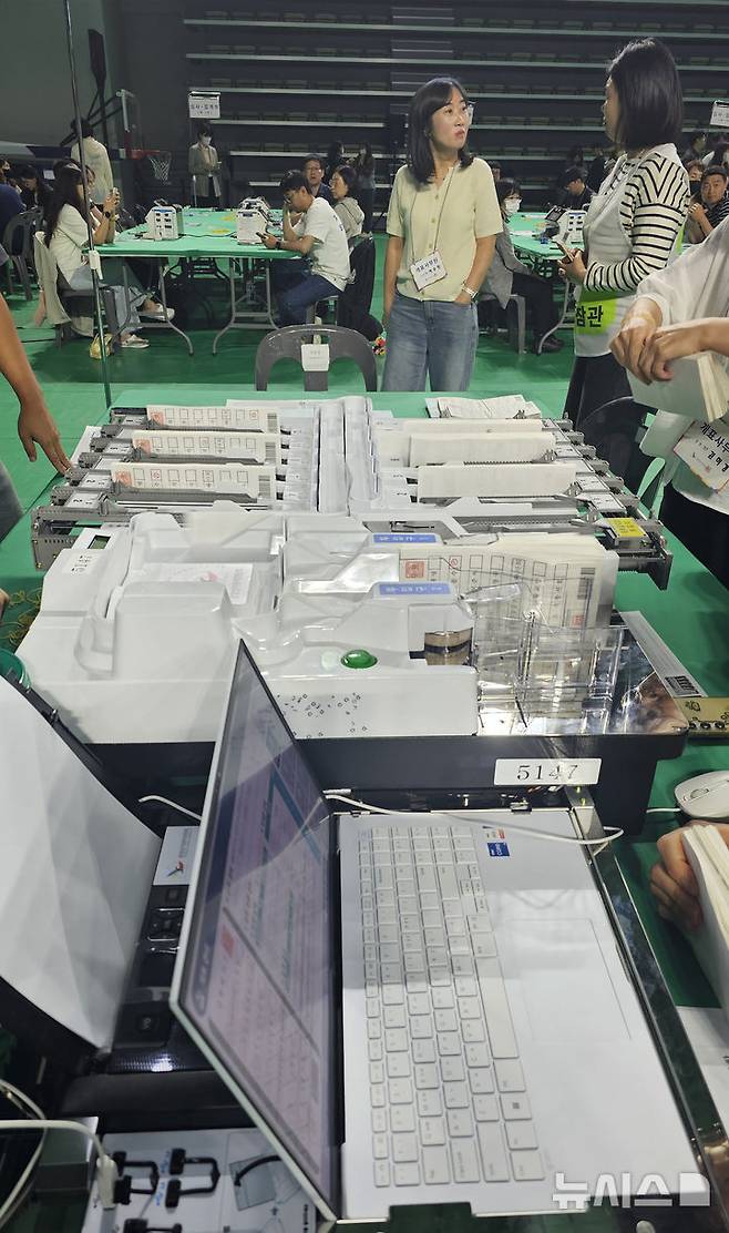 [울산=뉴시스] 배병수 기자 = 제21대 대통령선거일인 3일 오후 울산 남구 문수체육관에 마련된 개표소에서 개표가 진행되고 있다. 2025.06.03.bbs@newsis.com.