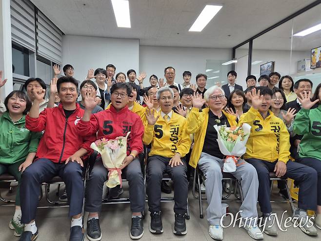 | ▲ 21대 대통령 선거 당일인 3일 오후 서울 구로구 민주노동당 당사에 차려진 개표상황실에서 권영국 민주노동당 후보를 비롯한 선대위 관계자들이 권 후보의 기호 5번을 상징하는 손가락을 5개를 함께 펼쳐 보이며 기념사진을 찍고 있다. |