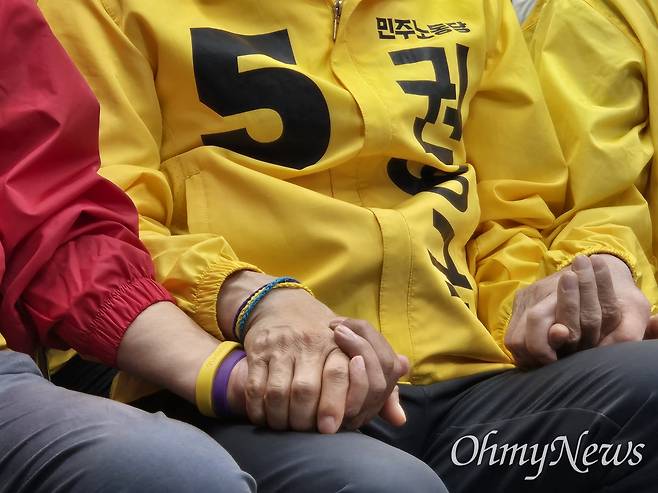 옆자리에 있던 한상균 공동선대위원장도 "12개 허들 중 7개를 넘었다. 나머지 5개 허들을 넘어서 진보 정치로 한국 사회의 해법을 만들자"라고 화답했다.