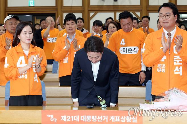 이준석 후보가 등장하자, 기대에 못 미치는 7.7%의 예상득표율로 침체됐던 개혁신당 개표상황실이 잠시 활기를 띠었다. 이 후보는 남색 정장에 넥타이를 메지 않은 모습이었다. 입구에서 지지자로부터 꽃다발 하나를 건네받은 이 후보는 "이준석" 이름을 연호하는 당 관계자들의 환대 속에 입장했다. 우레와 같은 박수소리와 카메라 플래시가 이 후보에게 쏟아졌다.