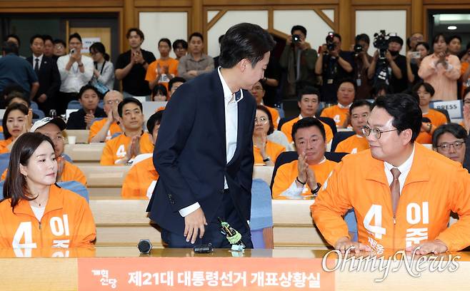 | ▲ 인사하는 이준석 후보 이준석 개혁신당 대선 후보가 3일 방송 3사 출구조사 결과를 확인한 뒤 서울 여의도 국회 의원회관에 마련된 개표상황실에 도착해 인사하고 있다. |