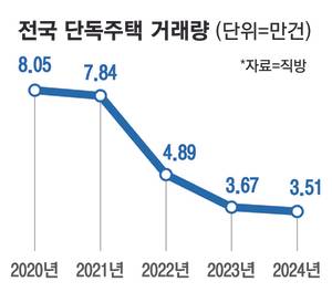 3일 부동산 플랫폼 직방에 따르면 전국 단독주택 거래량은 2020년 8만540건에서 2021년 7만8491건, 2022년 4만8988건, 2023년 3만6793건, 2024년 3만5137건으로 해마다 감소했다. 4년 새 단독주택 거래량이 절반 이상 감소했는데, 시도별로 보면 전 지역에서 거래량이 줄었다.