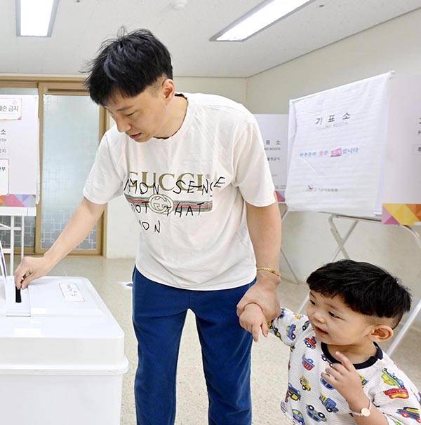 | 아빠랑 민주주의 체험 아들의 손을 잡고 나온 한 유권자가 3일 광주 동구 무등산리버파크 탁구장에 마련된 투표소에서 투표하고 있다./김애리 기자·조영권 인턴기자 |