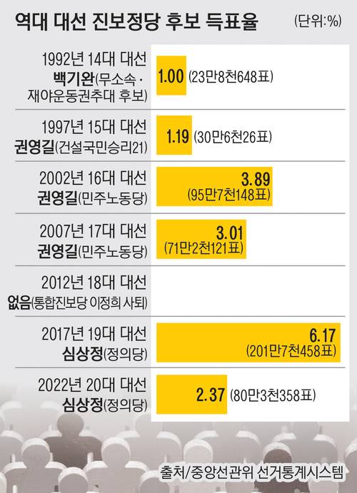 진보정당은 1987년 대통령 직선제 실시 이후 8번의 대선에서 6차례 후보를 냈다. 3% 이상을 득표하면 다가오는 지방선거와 총선에서 경쟁력을 보였지만, 3%를 넘지 못하면 차기 선거에서도 고전했다.