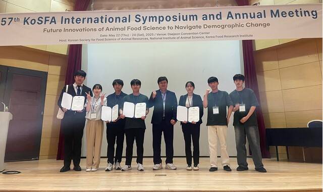 박상훈씨(박사 3년)는 '배양육 생산을 위한 FACS, Pre-plating과 Percoll 방법으로 정제한 한우 근육위성세포의 세포 정제와 세포자멸사 민감도 비교'를, 박규태 씨(박사 2년)는 '수벌번데기의 항산화 활성과 분지쇄아미노산(BCAA) 함량을 증가시키는 효소 가수분해'를 주제로 각각 발표해 우수 구두 발표상을 받았다.