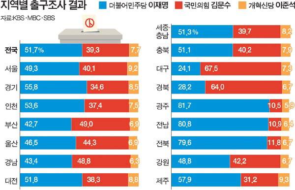 개혁신당 이준석 후보는 부산과 울산에서 각각 6.9%, 경남에서 6.3%를 얻는 것으로 예측됐다. 이밖에 ▷제주 9.3% ▷서울 9.2% ▷대전 8.8% 등으로 기록됐다.
