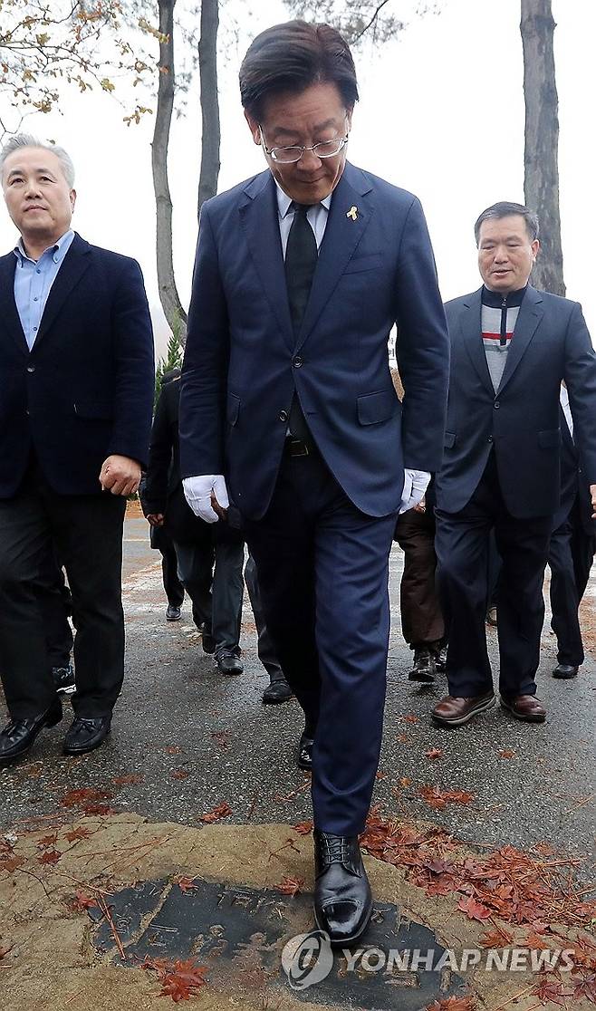 (서울=연합뉴스) 더불어민주당 이재명 대선 후보가 제21대 대통령 당선인으로 확실시되고 있다. 사진은 지난 2016년 11월 19일 광주 북구 망월동 민족민주열사묘지에 들어서며 '전두환 비석'을 밟는 모습. 2025.6.4 [연합뉴스 자료사진]