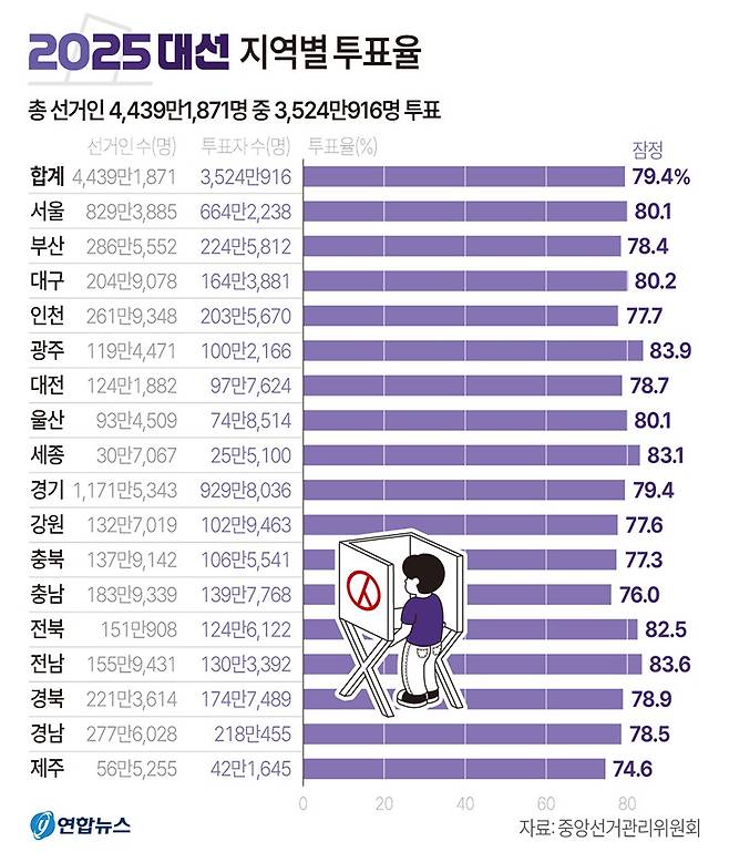[제21대 대선 투표율]광주 83.9% 1위·전남 83.6% 2위…전국 79.4%