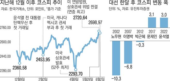 코스피는 주변국과 달리 새 정부 출범에 대한 기대감이 작용하고 있는 것으로 풀이된다. 한지영 키움증권 연구원은 “5월 말 코스피가 2700대에 진입할 수 있었던 것은 지주, 은행, 건설 등 대선 수혜주 강세도 상당 부분 기여했기 때문”이라며 “대선 유력 후보들이 코리아 디스카운트 해소를 정책 공약으로 내세운 점이 대선 수혜주의 주가 촉매제였다”고 말했다.