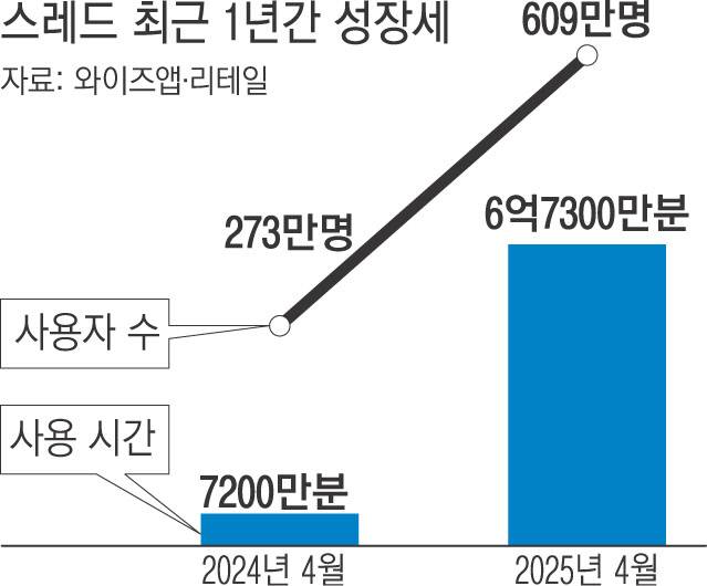 와이즈앱·리테일은 “해외에서 주로 각광받던 텍스트 기반 스레드도 국내에서 점점 사용자 수와 사용 시간을 확보해나가는 추세”라고 분석했다.