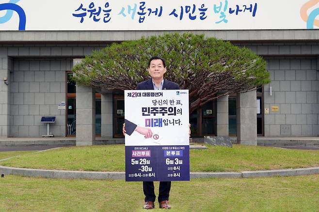 | ▲ 이재준 수원시장이 지난 2일 시 청사 앞에서 투표 안내판을 들고 투표 참여를 독려하고 있다. |