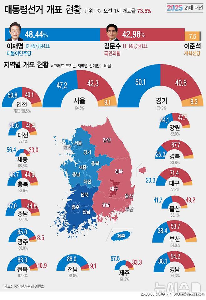 [서울=뉴시스] 대선 개표 현황. 오전 1시 개표율 73.5% 기준. (그래픽=전진우 기자)