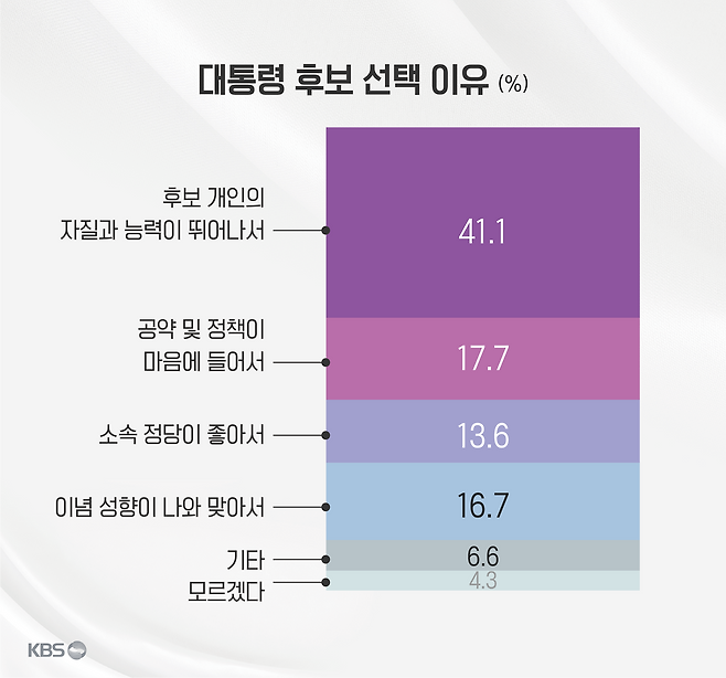 전체 응답자 41.1%는 대통령 후보를 선택한 이유로 '후보 개인의 자질과 능력이 뛰어나서'라고 답했습니다.