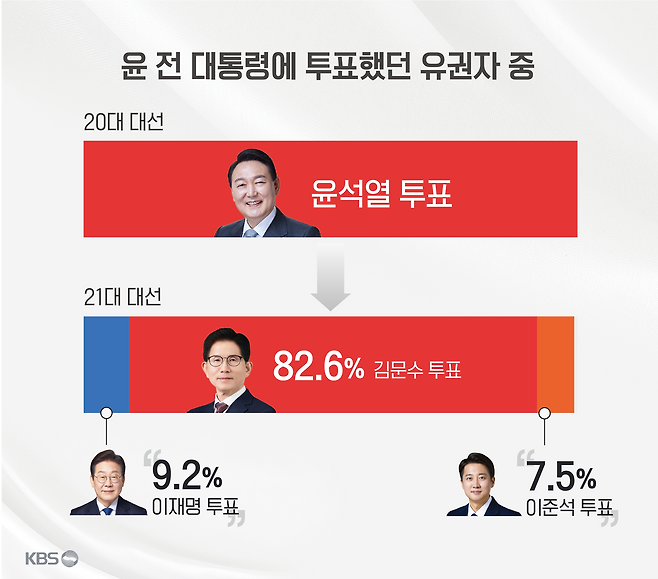 윤 전 대통령을 뽑았던 유권자 82.6%는 김문수 후보에 투표했습니다.