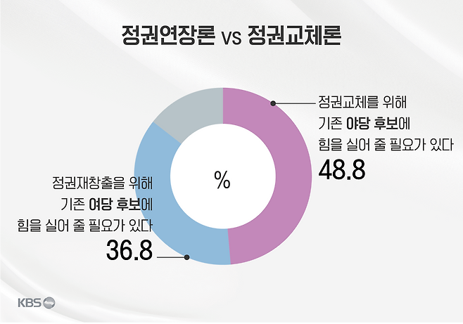 응답자의 48.8%가 '정권 교체를 위해 야당 후보에 힘을 실어줄 필요가 있다'고 답했고, 36.8%는 '정권 연장을 위해 여당 후보에 힘을 실어줄 필요가 있다'고 했습니다.