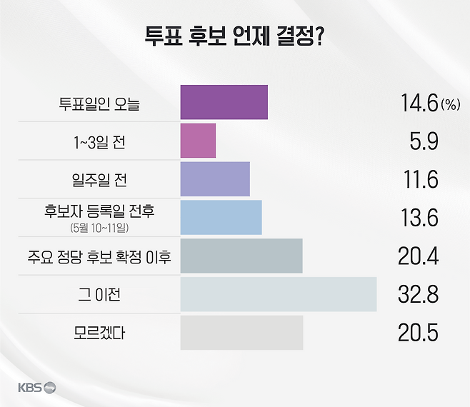 이어 '정당의 후보 확정 이후'(20.4%), '후보자 등록일 전후'(13.6%), '투표일인 오늘'(14.6%), 일주일 전(11.6%), 1~3일 전(5.9%)이었습니다.