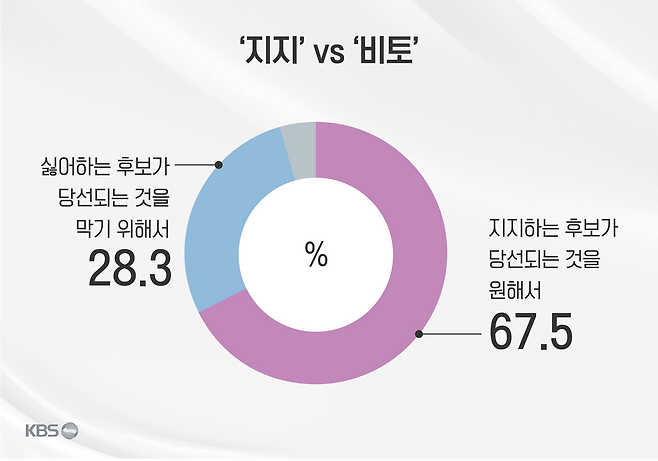 전체 응답자의 67.5%가 '지지하는 후보가 당선되는 것을 원해서' 투표했다고 답했고, '싫어하는 후보가 당선되는 것을 막기 위해서'라고 답한 응답자는 28.3%였습니다.