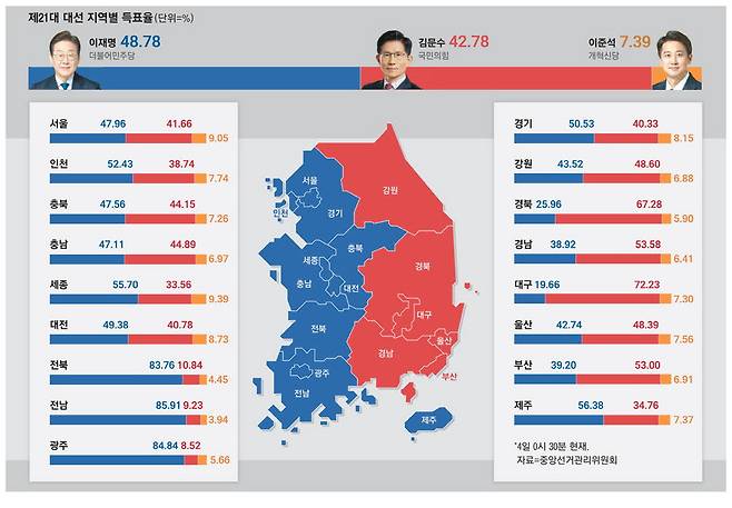 중앙선거관리위원회에 따르면 4일 오전 0시 30분 기준으로 전국 득표율은 이 당선인 48.78%, 김문수 국민의힘 후보 42.78%, 이준석 개혁신당 후보 7.39%를 기록했다.