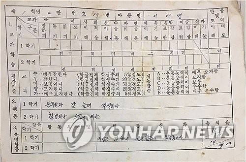 (서울=연합뉴스) 더불어민주당 이재명 대선 후보가 제21대 대통령 당선인으로 확실시되고 있다. 사진은 이 후보의 초등학교 1학년 생활기록부. 2025.6.4 [더불어민주당 제공. 재판매 및 DB 금지]