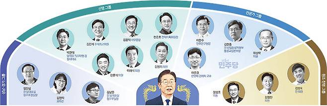 위성락 의원은 외교부 북미국장과 한반도 평화교섭본부장 경험을 살려 이 후보의 외교안보 정책 공약 수립에 기여했고, 향후에도 자문을 이어갈 것으로 보인다. 이 당선인의 대장동 사건 변호를 맡은 뒤 원내로 들어온 박균택·양부남·이건태 의원은 법률 참모로서 이 당선인과 당에 자문을 해왔다.
