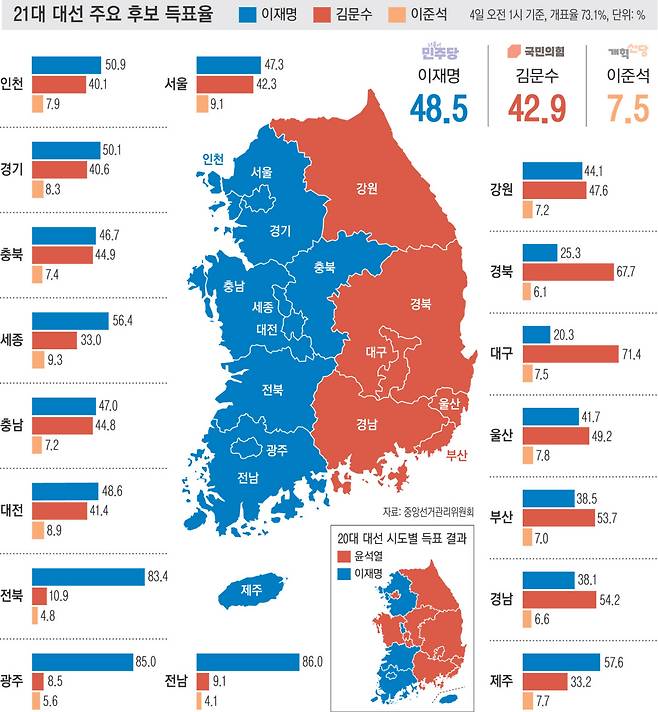 이 당선인은 전국 17개 시도 가운데 서울·인천·경기 등 11곳에서 우위를 점했다. 김 후보가 이 당선인보다 많은 표를 얻은 곳은 대구·경북·경남 등 6곳으로 나왔다. 이준석 개혁신당 후보의 득표율은 7.5%로 집계됐다.