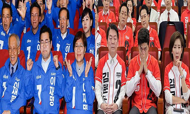 | 박수와 침울 사이 3일 이재명 대통령 당선인이 12.4%포인트 앞서는 제21대 대통령선거 방송3사 출구조사 결과가 발표되자 양당의 희비가 엇갈리고 있다. 더불어민주당 관계자들이 서울 여의도 국회의원회관 개표상황실에서 손뼉을 치고 있다(왼쪽 사진). 앞줄 왼쪽부터 윤여준·박찬대·정은경 선대위원장. 국민의힘의 관계자들은 여의도 국회도서관에 마련된 국민의힘 개표상황실에서 침울한 표정을 짓고 있다(오른쪽 사진). 앞줄 왼쪽부터 안철수·김용태·나경원 선대위원장. 허정호 선임기자, 이재문 기자 |