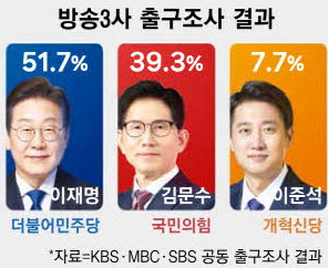 3일 투표 마감 직후 발표된 KBS·MBC·SBS 방송3사 출구조사에서는 이 당선인이 과반인 51.7% 득표율을 기록할 것으로 예상됐다. 김문수 국민의힘 후보는 39.3%로 오차범위 밖에서 2위를 차지했다. 이준석 개혁신당 후보는 7.7%로 선거비용 일부를 보전받을 수 있는 10%의 벽을 넘지 못했다.