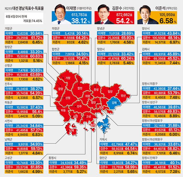 창녕군과 합천군은 이재명 후보 지지율이 각각 28.69%, 24.5%로 20%대 지지율을 기록하며 진보세가 가장 약했다. 창원시 진해구에서는 이재명 40.1%, 김문수 51.52%였고, 이밖에도 이재명 후보 득표율은 창원시 의창구 37.44%, 창원시 성산구 39.61%, 창원시 마산합포구 31.88%, 창원시 마산회원구 33.61%, 진주시 38.27%, 통영시 34.49%, 사천시 34.84%, 밀양시 33.42%였다.