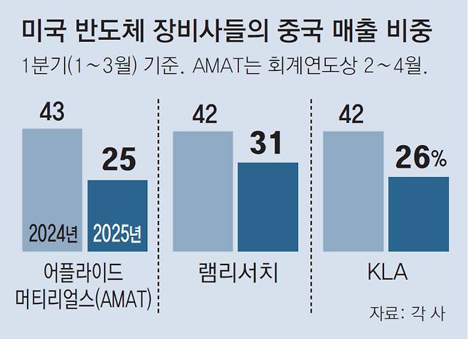글로벌 반도체 장비회사 '빅5' 중 미국 회사인 어플라이드 머티리얼스(AMAT), 램리서치, KLA 등 3사는 올 1분기 총매출에서 중국이 차지하는 비중이 기존 40%대에서 20∼30% 수준으로 떨어졌다.