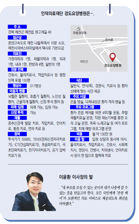 인덕의료재단(이사장 이윤환)이 운영하는 이 두 병원은 환자 중심의 ‘존엄 케어’ 실천 사례로 전국에서 손꼽힌다. 재활병원, 요양병원, 요양원이 한 단지 안에 함께 운영되는 국내 최초의 재활형 ‘의료복지복합체’이기도 하다.