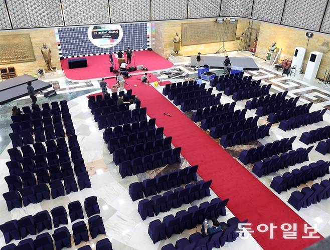 | 21대 대통령 취임 선서식 열릴 국회 로텐더홀 제21대 대통령 선거가 치러진 3일 오후 서울 여의도 국회 로텐더홀에서 제21대 대통령 취임 선서식 준비를 하고 있다. 이번 대선은 윤석열 전 대통령의 파면으로 치러졌기 때문에 신임 대통령의 임기는 당선이 확정된 때부터 시작된다. 장승윤 기자 tomato99@donga.com |