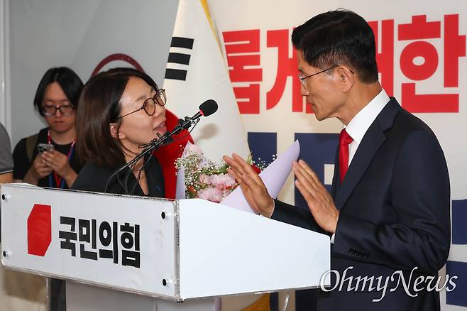 김문수 국민의힘 대선 후보가 4일 서울 여의도 당사에서 대선 결과에 승복하는 기자회견을 마치고 관계자가 꽃다발을 전달하자 사양하고 있다.