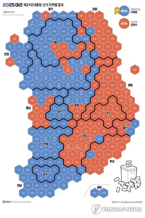[그래픽] 2025 대선 제21대 대통령 선거 지역별 결과(95% 개표)