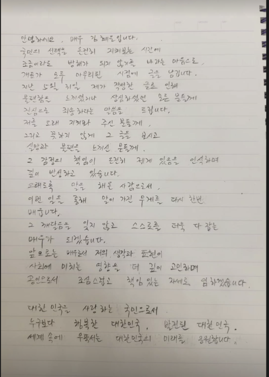 3일 김혜은은 개인 SNS를 통해 자필 사과문을 게재했다.