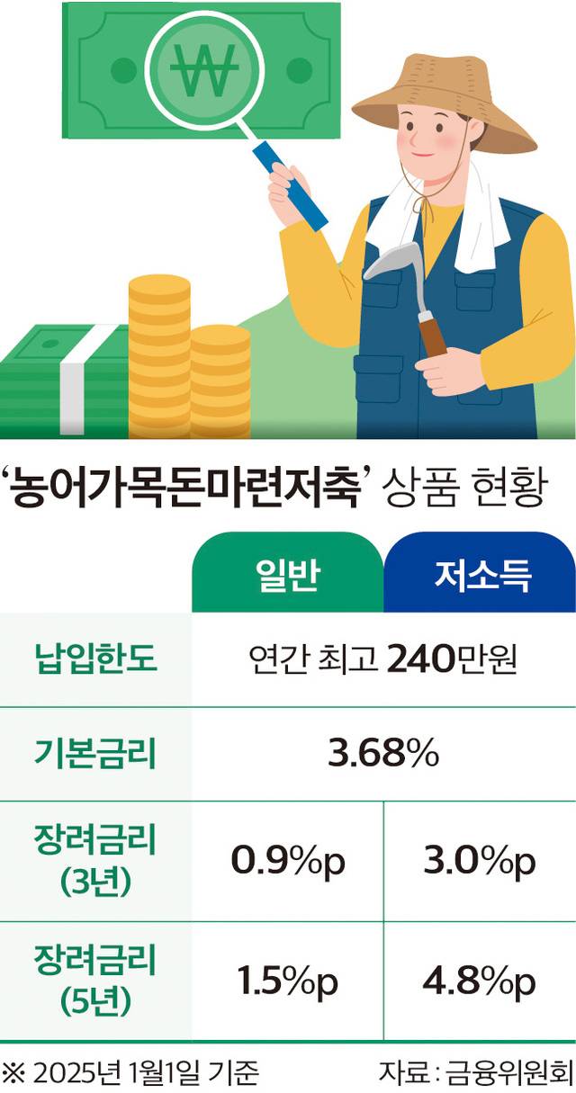 농업계는 농어가목돈마련저축 상품의 개선을 꾸준히 요구하고 있다. 사실상 정부가 지원하는 농민 전용 금융상품은 농어가목돈마련저축뿐인데, ‘목돈 형성’과는 거리가 멀다는 지적이 크기 때문이다. 이 상품은 연간 납입한도 240만원으로 3년·5년 만기 상품이다. 기본금리는 연 3.68%(2025년 기준)며, 장려금리로는 저소득의 경우 3년 3.0%포인트와 5년 4.8%포인트, 일반의 경우 3년 0.9%포인트와 5년 1.5%포인트가 기본금리에 더해진다. 올해 기준 만기 상품 최대 금리는 8.48%다.