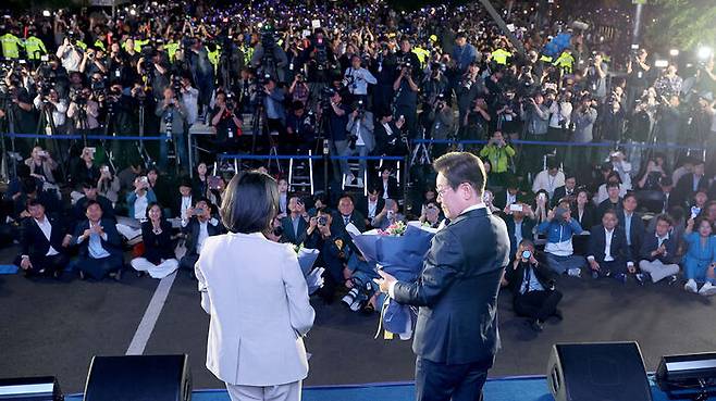 ▲ 국민개표방송 행사장 찾은 이재명 후보 내외