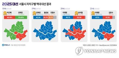 [그래픽] 2025 대선 서울시 자치구별 역대 대선 결과