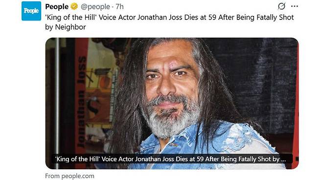 미국에서 TV 애니메이션 시리즈 '킹 오브 더 힐'(King of the Hill)의 목소리 연기 등으로 알려진 배우 조너선 조스(59)가 자택 인근에서 총격으로 사망했다고 AP통신 등 미 언론이 2일(현지시간) 전했습니다.