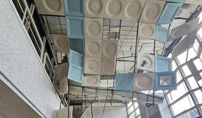어제(3일) 오후 2시 29분 청주시 사직동 청주실내수영장 1층 로비의 천장 마감재 일부(약 30㎡)가 약 10m 아래 바닥으로 무너져 내렸습니다.