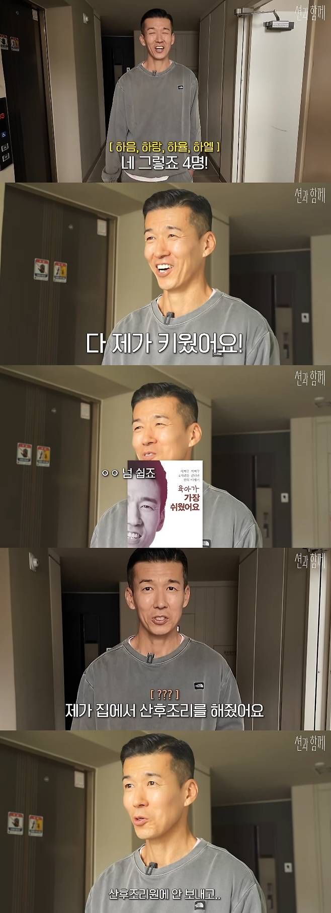 제작진이 "(그래도) 4명이면 쉽지 않은데"라고 하자, 션은 "첫째, 둘째는 제가 집에서 산후조리를 해줬다. 산후조리원에 안 보이고. 부모님 도움도 안 받고"라고 말했고, 이어 "셋째 때는 엄마하고 같은 공간에 있으면 자꾸 엄마를 찾을 수밖에 없다. 그래서 셋째 때부턴 산후조리원에 보냈다"고 덧붙였다.