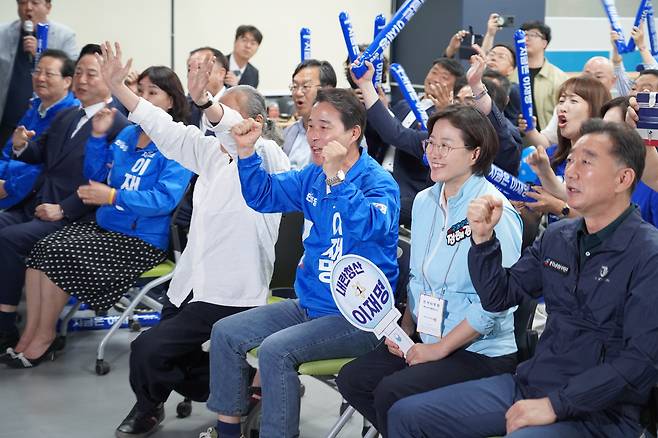 | ▲ 대통령선거가 치러진 6월 3일 저녁 8시경 방송3사 출구여론조사가 나오자 더불어민주당 경남도당에 모인 사람들이 환호성을 지르고 있다. |