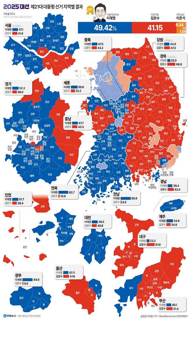 4일 중앙선거관리위원회 최종 개표 결과, 이재명 대통령은 49.42%, 국민의힘 김문수 후보는 41.15%, 개혁신당 이준석 후보는 8.34%를 각각 기록했다. 민주노동당 권영국 후보는 0.98%, 무소속 송진호 후보는 0.10%였다.