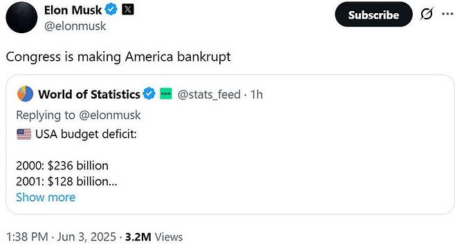 또 몇 분 뒤에 다시 미국의 재정적자 증가 추이를 기록한 다른 게시물을 공유하며 "의회는 미국을 파산하게 만들고 있다" 고 비판했습니다.